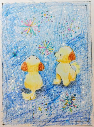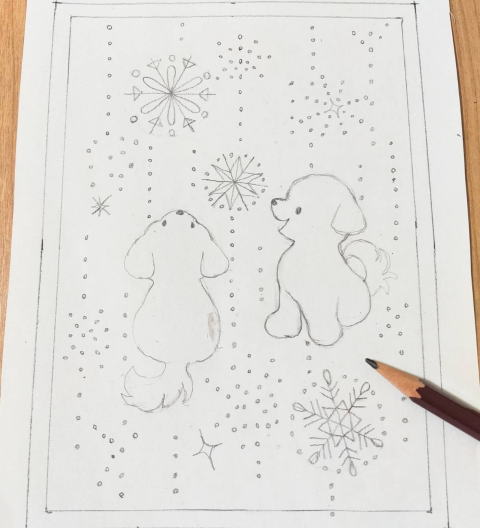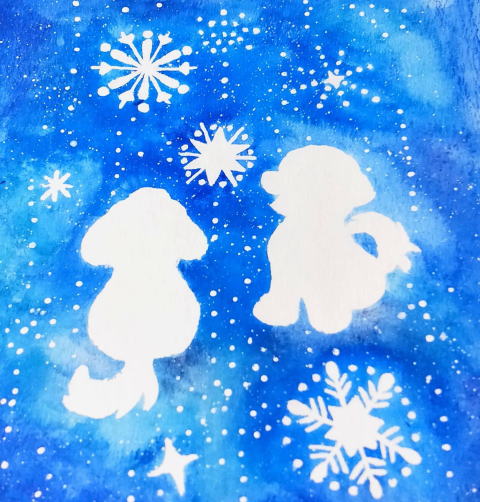 ワンちゃんと雪の絵を描いています♪